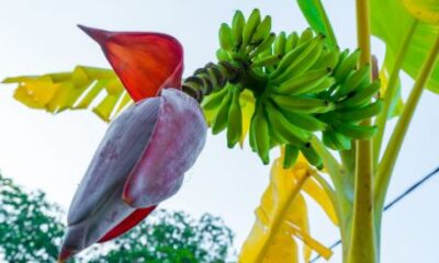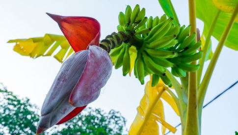 Banana blossom, also known as banana flower or banana heart, is a beautiful, purple-red, tear-shaped blossom that grows at the end of a banana fruit cluster....
